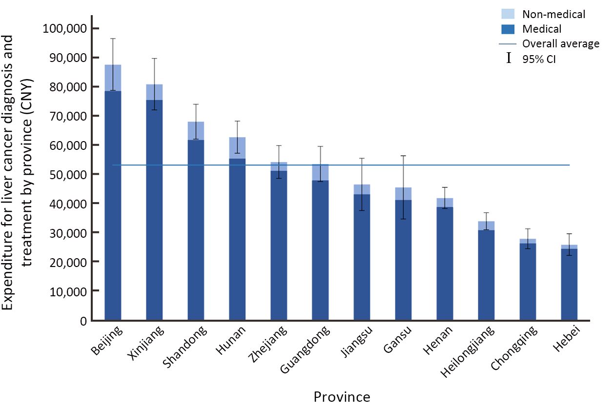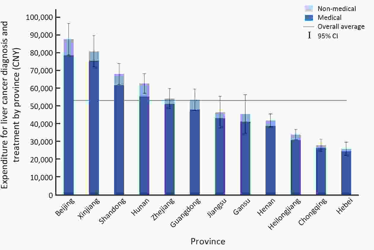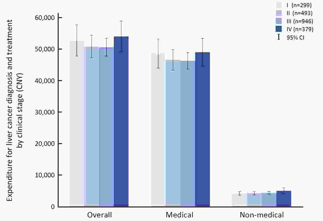 ObjectiveThe number of liver cancer patients in China accounts for more than half of the world. However, China currently lacks national, multicenter economic burden data, and meanwhile, measuring the differences among different subgroups will be informative to formulate corresponding policies in liver cancer control. Thus, the aim of the study was to measure the economic burden of liver cancer by various subgroups. MethodsA hospital-based, multicenter and cross-sectional survey was conducted during 2012-2014, covering 39 hospitals and 21 project sites in 13 provinces across China. The questionnaire covers clinical information, sociology, expenditure, and related variables. All expenditure data were reported in Chinese Yuan (CNY) using 2014 values. ResultsA total of 2,223 liver cancer patients were enrolled, of whom 59.61% were late-stage cases (III-IV), and 53.8% were hepatocellular carcinoma. The average total expenditure per liver cancer patient was estimated as 53,220 CNY, including 48,612 CNY of medical expenditures (91.3%) and 4,608 CNY of non-medical expenditures (8.7%). The average total expenditures in stage I, II, III and stage IV were 52,817 CNY, 50,877 CNY, 50,678 CNY and 54,089 CNY (P>0.05), respectively. Non-medical expenditures including additional meals, additional nutrition care, transportation, accommodation and hired informal nursing were 1,453 CNY, 839 CNY, 946 CNY, 679 CNY and 200 CNY, respectively. The one-year out-of-pocket expenditure of a newly diagnosed patient was 24,953 CNY, and 77.2% of the patients suffered an unmanageable financial burden. Multivariate analysis showed that overall expenditure differed in almost all subgroups (P<0.05), except for sex, clinical stage, and pathologic type. ConclusionsThere was no difference in treatment expenditure for liver cancer patients at different clinical stages, which suggests that maintaining efforts on treatment efficacy improvement is important but not enough. To furtherly reduce the overall economic burden from liver cancer, more effort should be given to primary and secondary prevention strategies.