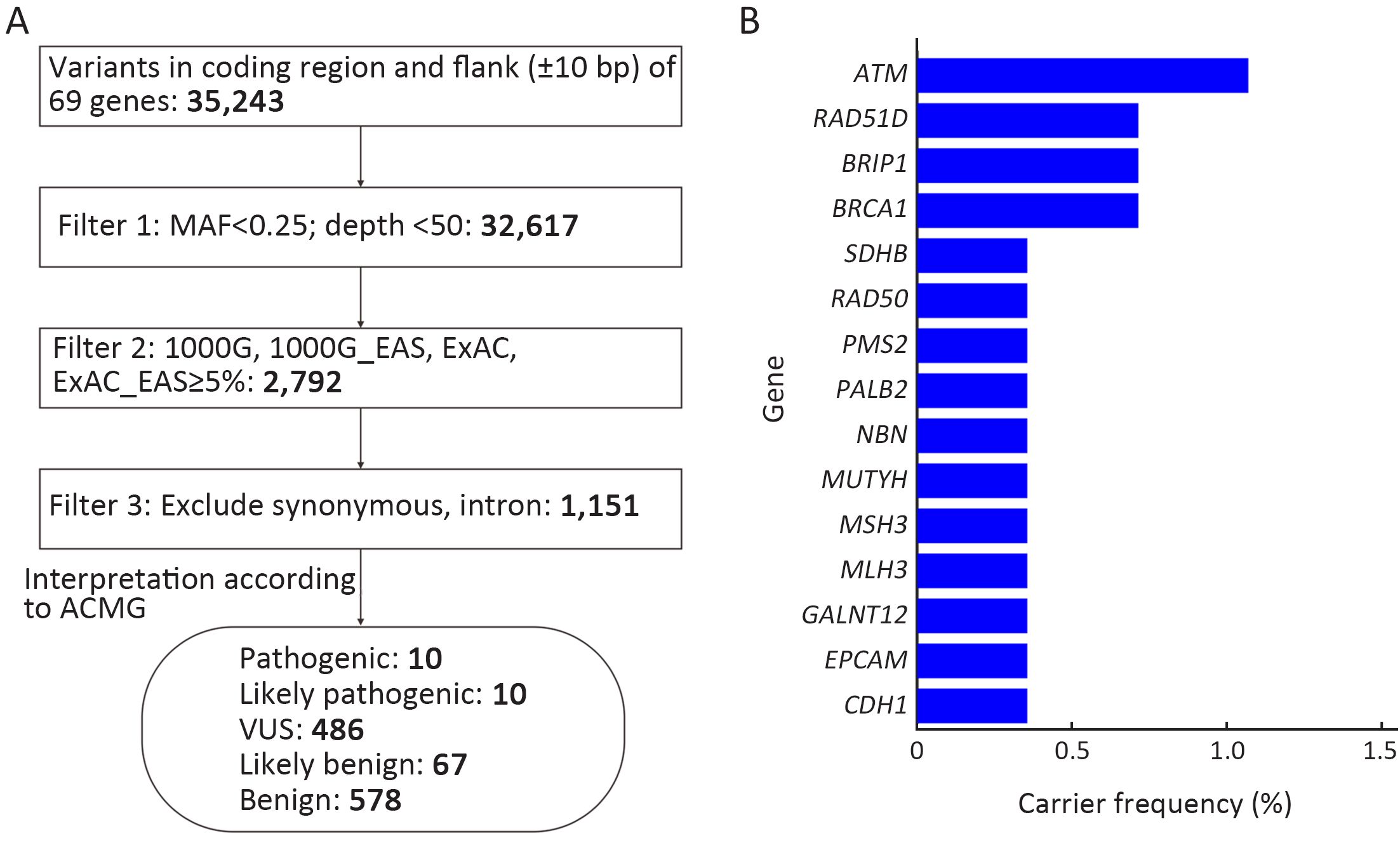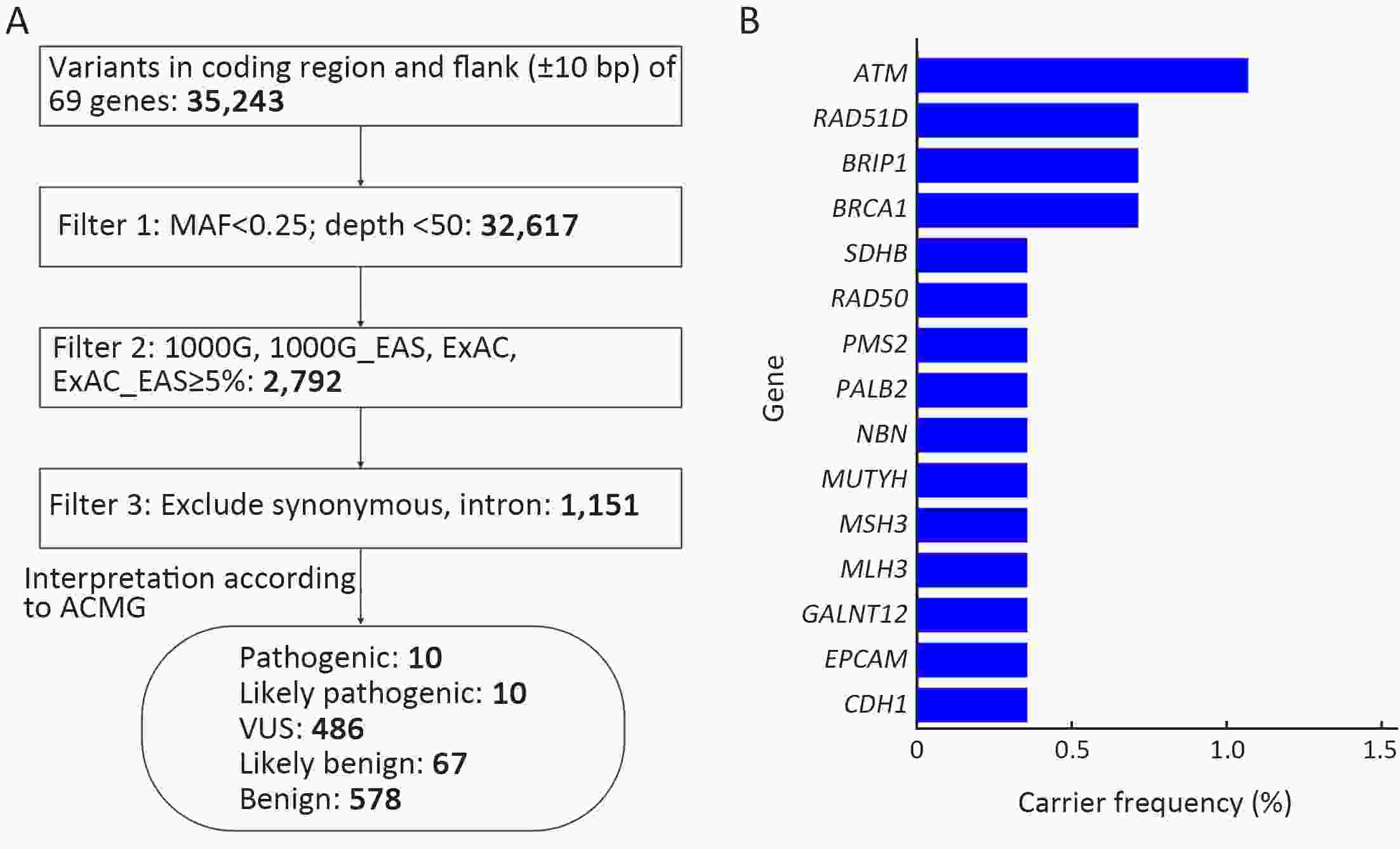 ObjectiveTo reveal the distribution signature of cancer susceptibility genes in patients with gastric adenocarcinoma, offering a diagnostic and prognostic surrogate for disease risk management and therapeutic decisions. MethodsA total of 282 patients with gastric adenocarcinoma (182 males and 100 females) were enrolled in this study, with peripheral blood genomic DNA extracted. Mutations of 69 canonical cancer susceptibility genes or presumably tumor-related genes were analyzed by targeted capture-based high-throughput sequencing. Candidate mutations were particularly selected for discussion on tumor pathogenesis according to the American College of Medical Genetics and Genomics (ACMG) guidelines. ResultsIn this study, 7.1% (20/282) of patients with gastric adenocarcinoma were found to harbor mutations of canonical or presumable cancer susceptibility genes. The detection rate in male patients (3.8%, 7/182) was significantly lower than that in female patients (13%, 13/100) (P=0.004). The most recurrent mutations were in A-T mutated (ATM) (1.1%, 3/282), followed by BRCA1, BRIP1 and RAD51D, all showed a detection rate of 0.7% (2/282). Mutations in three genes associated with hereditary gastric cancer syndromes were detected, namely, PMS2 and EPCAM associated with Lynch syndrome and CDH1 associated with hereditary diffuse gastric cancer. The detection frequencies were all 0.4% (1/282). Notwithstanding no significant difference observed, the age of patients with pathogenic mutations or likely pathogenic mutations is slightly younger than that of non-carriers (median age: 58.5 vs. 60.5 years old), while the age of patients with ATM mutations was the youngest overall (median age: 49.3 years old). ConclusionsOur study shed more light on the distribution signature and pathogenesis of mutations in gastric cancer susceptibility genes, and found the detection rate of pathogenic and likely pathogenic mutations in male patients was significantly lower than that in female patients. Some known and unidentified mutations were found in gastric cancer, which allowed us to gain more insight into the hereditary gastric cancer syndromes from the molecular perspective.