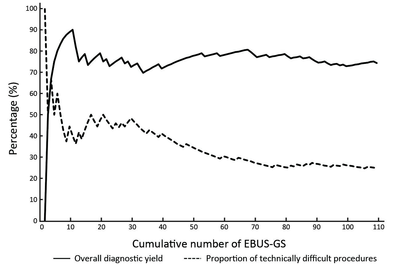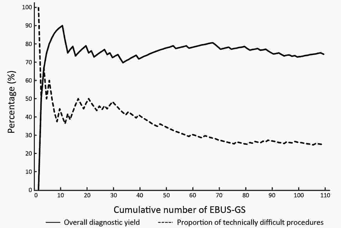 ObjectiveFluoroscopy guidance is generally required for endobronchial ultrasonography with guide sheath (EBUS-GS) in peripheral pulmonary lesions (PPLs). Virtual bronchoscopic navigation (VBN) can guide the bronchoscope by creating virtual images of the bronchial route to the lesion. The diagnostic yield and safety profiles of VBN without fluoroscopy for PPLs have not been evaluated in inexperienced pulmonologist performing EBUS-GS. MethodsBetween January 2016 and June 2017, consecutive patients with PPLs referred for EBUS-GS at a single cancer center were enrolled. The diagnostic yield as well as safety profiles was retrospectively analyzed, and our preliminary experience was shared. ResultsA total of 109 patients with 109 lesions were included, 99 (90.8%) lesions were visible on EBUS imaging. According to the procedure time needed to locate the lesion on EBUS, 24.8% (27/109) were deemed technically difficult procedures; however, no significant relationships were identified between candidate parameters and technically difficult procedures. The overall diagnosis yield was 74.3% (81/109), and the diagnostic yield of malignancy was 83.7% (77/92). Lesions larger than 20 mm [odds ratio (OR), 2.758; 95% confidence interval (95% CI), 1.077−7.062; P=0.034] and probe of within type (OR, 3.174; 95% CI, 1.151−8.757, P=0.026) were independent factors leading to a better diagnostic yield in multivariate analysis. About 30 practice procedures were needed to achieve a stable diagnostic yield, and the proportion of technically difficult procedures decreased and stabilized after 70 practice procedures. Regarding complications, one patient (0.9%) had intraoperative hemorrhage (100 mL) which was managed under endoscopy. ConclusionsVBN without fluoroscopy guidance is still useful and safe for PPLs diagnosis, especially for malignant diseases when performed by pulmonologist without previous experience of EBUS-GS. VBN may simplify the process of lesion positioning and further multi-center randomized studies are warranted.