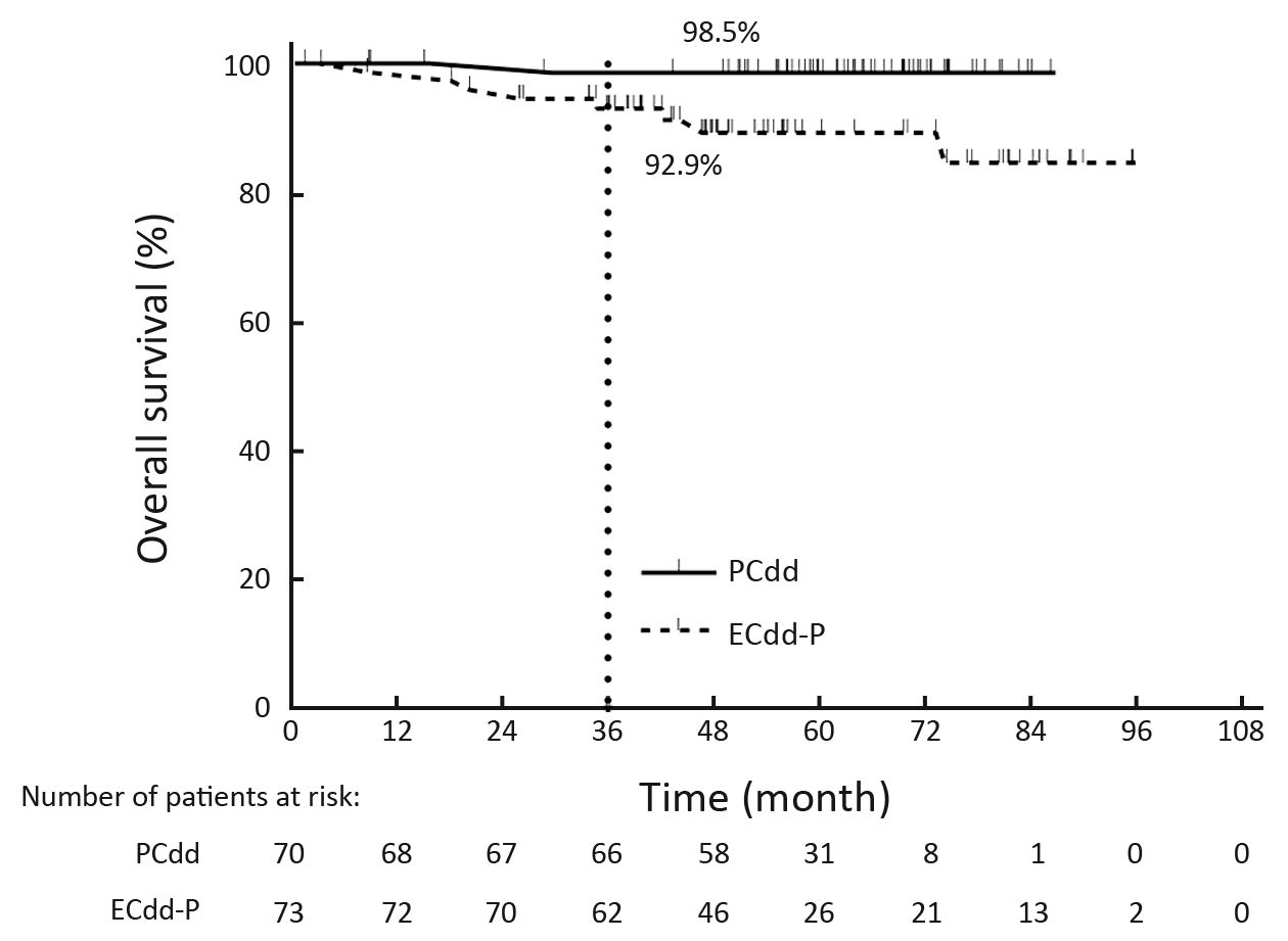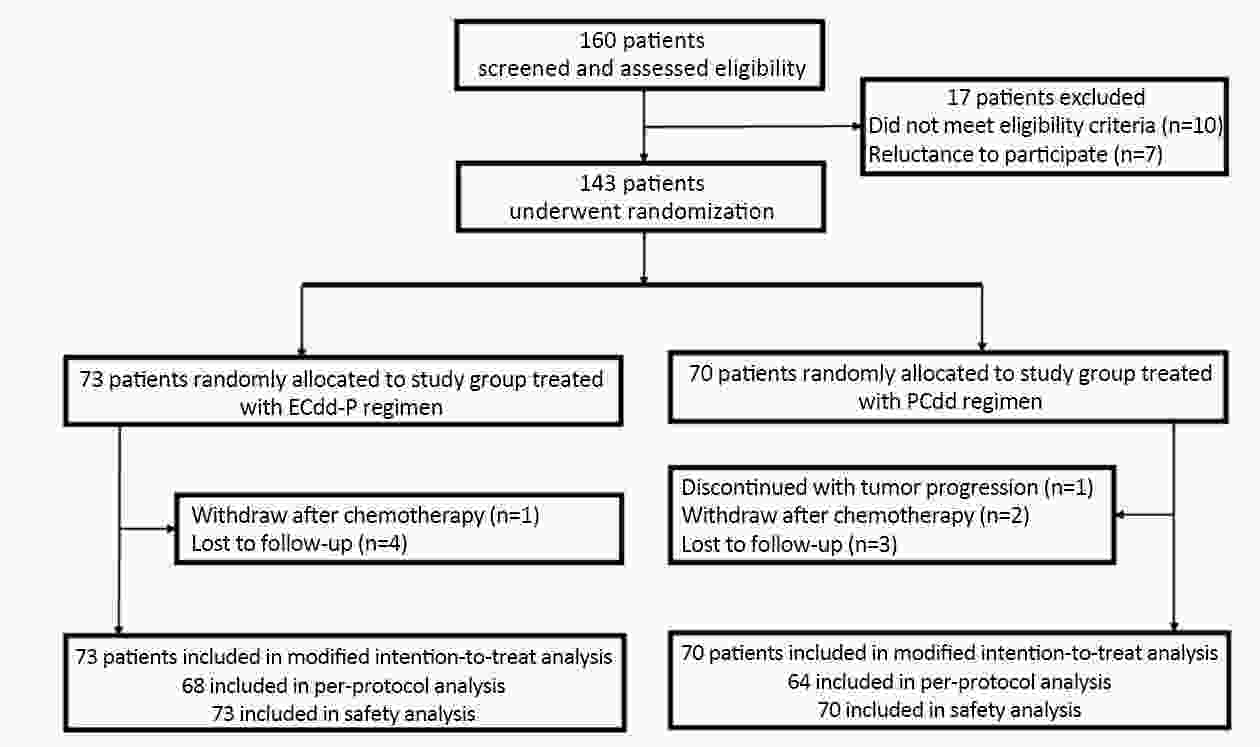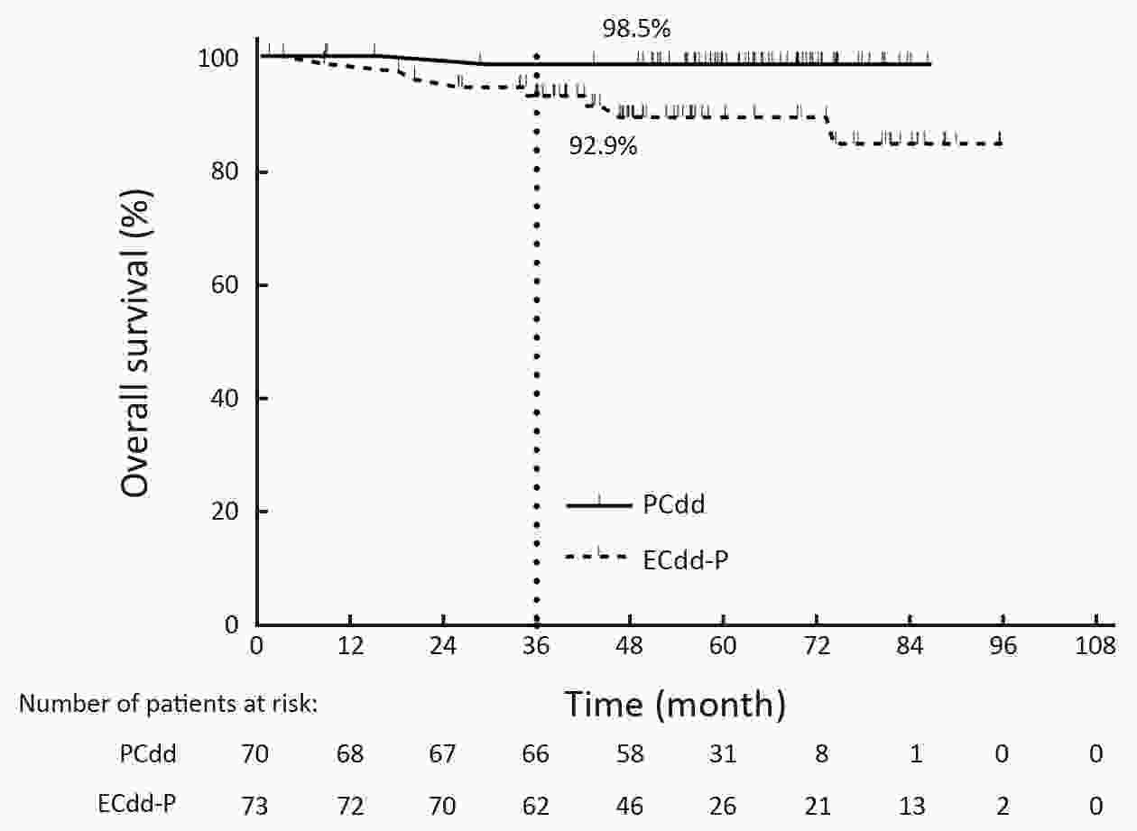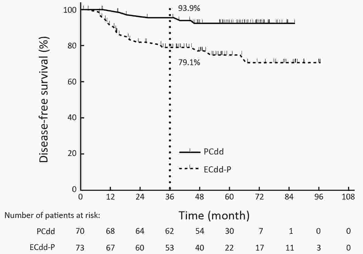 ObjectiveThe objective of this open-label, randomized study was to compare dose-dense paclitaxel plus carboplatin (PCdd) with dose-dense epirubicin and cyclophosphamide followed by paclitaxel (ECdd-P) as an adjuvant chemotherapy for early triple-negative breast cancer (TNBC). MethodsWe included Chinese patients with high recurrence risk TNBC who underwent primary breast cancer surgery. They were randomly assigned to receive PCdd [paclitaxel 150 mg/m2 on d 1 and carboplatin, the area under the curve, (AUC)=3 on d 2] or ECdd-P (epirubicin 80 mg/m2 divided in 2 d and cyclophosphamide 600 mg/m2 on d 1 for 4 cycles followed by paclitaxel 175 mg/m2 on d 1 for 4 cycles) every 2 weeks with granulocyte colony-stimulating factor (G-CSF) support. The primary endpoint was 3-year disease-free survival (DFS); the secondary endpoints were overall survival (OS) and safety. ResultsThe intent-to-treat population included 143 patients (70 in the PCdd arm and 73 in the ECdd-P arm). Compared with the ECdd-P arm, the PCdd arm had significantly higher 3-year DFS [93.9% vs. 79.1%; hazard ratio (HR)=0.310; 95% confidence interval (95% CI), 0.137−0.704; log-rank, P=0.005] and OS (98.5% vs. 92.9%; HR=0.142; 95% CI, 0.060−0.825; log-rank, P=0.028). Worse neutropenia (grade 3/4) was found in the ECdd-P than the PCdd arm (47.9% vs. 21.4%, P=0.001). ConclusionsPCdd was superior to ECdd-P as an adjuvant chemotherapy for early TNBC with respect to improving the 3-year DFS and OS. PCdd also yielded lower hematological toxicity. Thus, PCdd might be a preferred regimen for early TNBC patients with a high recurrence risk.