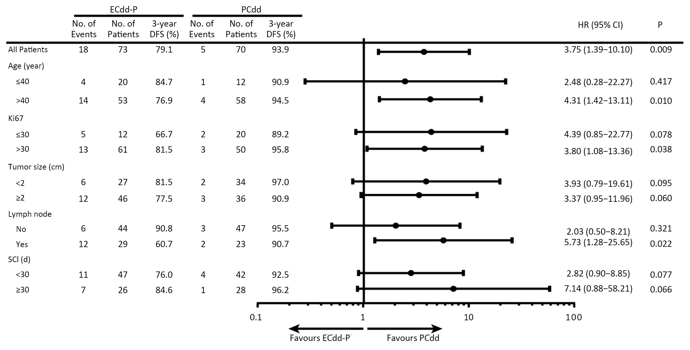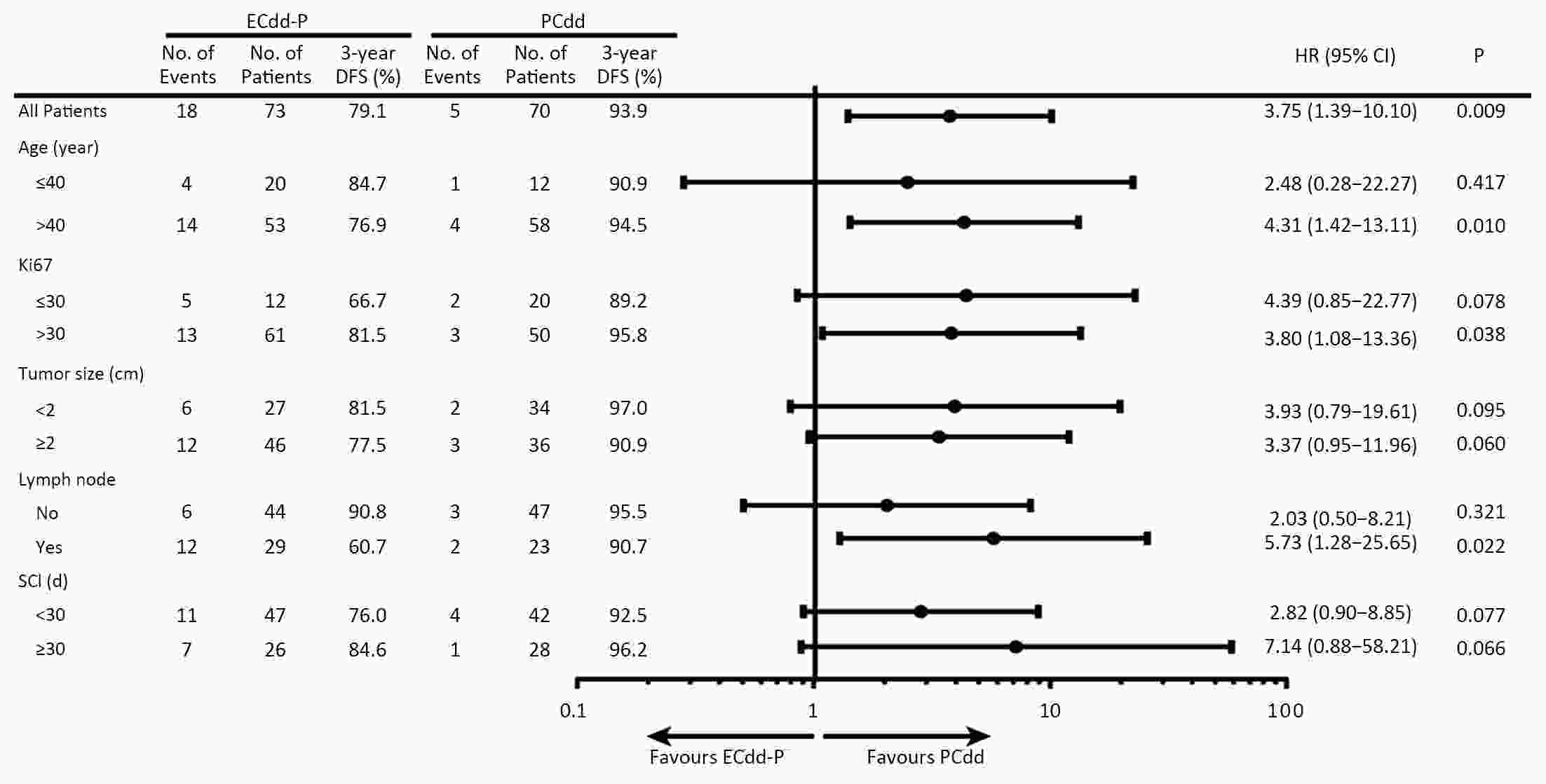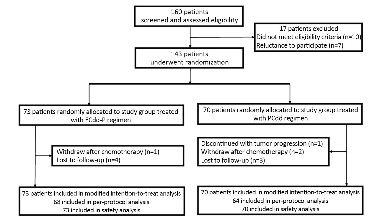 ObjectiveThe objective of this open-label, randomized study was to compare dose-dense paclitaxel plus carboplatin (PCdd) with dose-dense epirubicin and cyclophosphamide followed by paclitaxel (ECdd-P) as an adjuvant chemotherapy for early triple-negative breast cancer (TNBC). MethodsWe included Chinese patients with high recurrence risk TNBC who underwent primary breast cancer surgery. They were randomly assigned to receive PCdd [paclitaxel 150 mg/m2 on d 1 and carboplatin, the area under the curve, (AUC)=3 on d 2] or ECdd-P (epirubicin 80 mg/m2 divided in 2 d and cyclophosphamide 600 mg/m2 on d 1 for 4 cycles followed by paclitaxel 175 mg/m2 on d 1 for 4 cycles) every 2 weeks with granulocyte colony-stimulating factor (G-CSF) support. The primary endpoint was 3-year disease-free survival (DFS); the secondary endpoints were overall survival (OS) and safety. ResultsThe intent-to-treat population included 143 patients (70 in the PCdd arm and 73 in the ECdd-P arm). Compared with the ECdd-P arm, the PCdd arm had significantly higher 3-year DFS [93.9% vs. 79.1%; hazard ratio (HR)=0.310; 95% confidence interval (95% CI), 0.137−0.704; log-rank, P=0.005] and OS (98.5% vs. 92.9%; HR=0.142; 95% CI, 0.060−0.825; log-rank, P=0.028). Worse neutropenia (grade 3/4) was found in the ECdd-P than the PCdd arm (47.9% vs. 21.4%, P=0.001). ConclusionsPCdd was superior to ECdd-P as an adjuvant chemotherapy for early TNBC with respect to improving the 3-year DFS and OS. PCdd also yielded lower hematological toxicity. Thus, PCdd might be a preferred regimen for early TNBC patients with a high recurrence risk.