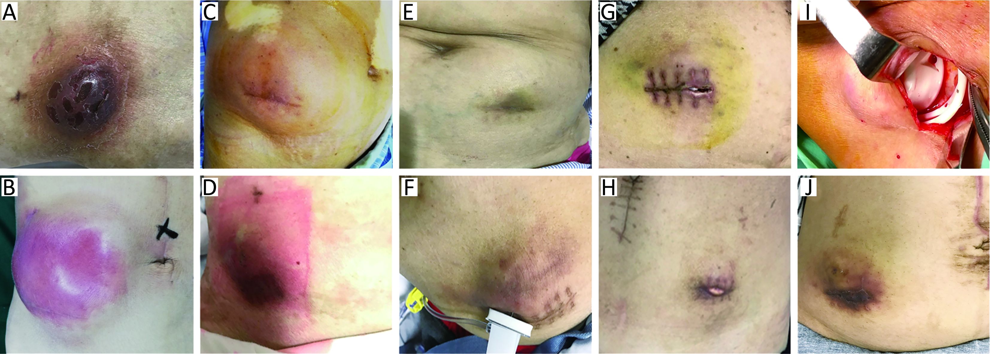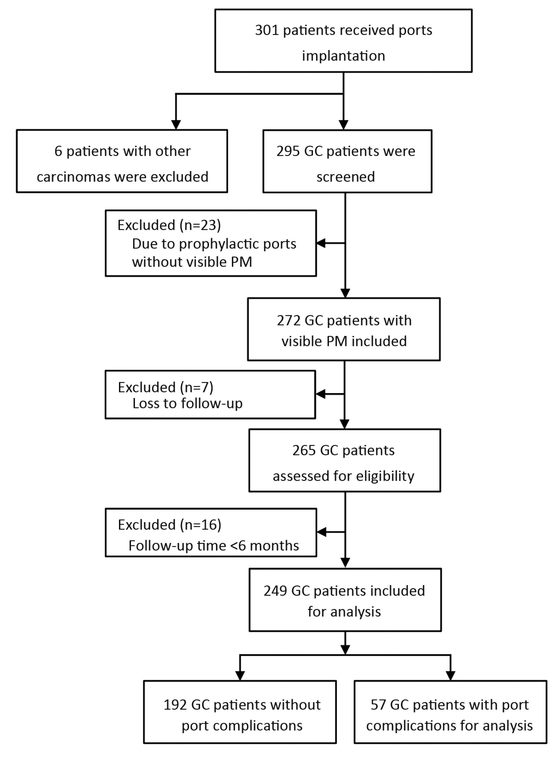 ObjectiveIntraperitoneal (IP) chemotherapy through subcutaneous port is an effective treatment for gastric cancer (GC) patients with peritoneal metastasis (PM). The objective of this study is to assess the port complications and risk factors for complications in GC patients with PM. MethodsIn retrospective screening of 301 patients with subcutaneous ports implantation, 249 GC patients with PM who received IP chemotherapy were screened out for analysis. Port complications and risk factors for complications were analyzed. ResultsOf the 249 analyzed patients, 57 (22.9%) experienced port complications. Subcutaneous liquid accumulation (42.1%) and infection (28.1%) were the main complications, and other complications included port rotation (14.1%), wound dehiscence (12.3%), inflow obstruction (1.7%) and subcutaneous metastasis (1.7%). The median interval between port implantation and occurrence of complications was 3.0 months. Eastern Cooperative Oncology Group (ECOG) performance status [odds ratio (OR), 1.74; 95% confidence interval (95% CI), 1.12−2.69], albumin (OR, 3.67; 95% CI, 1.96−6.86), implantation procedure optimization (OR, 0.33; 95% CI, 0.18−0.61) and implantation groups (OR, 0.37; 95% CI, 0.20−0.69) were independent risk factors for port complications (P<0.05). ECOG performance status was the only factor that related to the grades of port complications (P=0.016). ConclusionsPort complications in GC patients who received IP chemotherapy are manageable. ECOG performance status, albumin, implantation procedure and implantation group are independent risk factors for port complications in GC patients with PM.